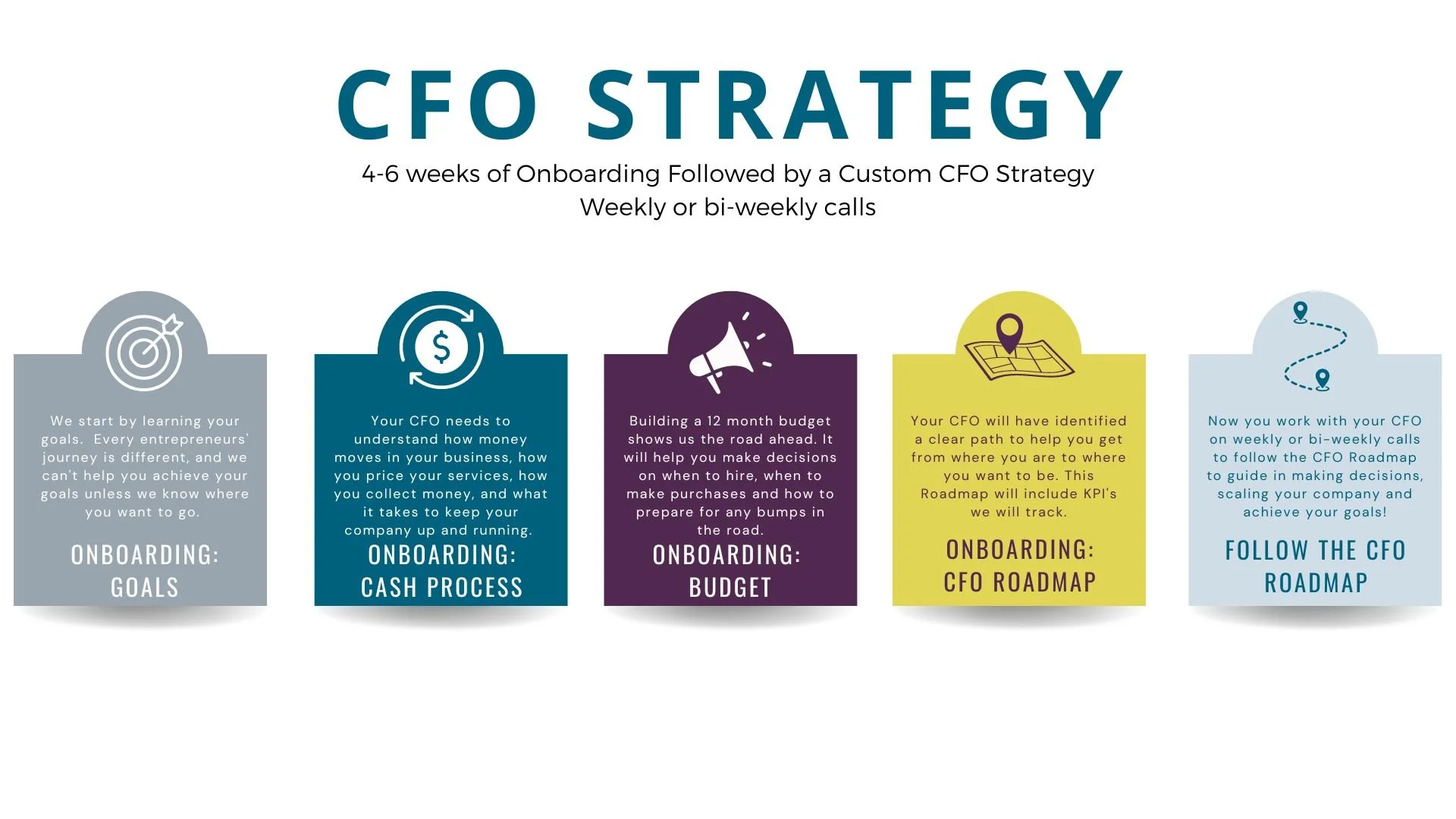 Our certified team of Chief Financial Officers (CFO’s) have spent their careers scaling companies. They use a variety of tools and techniques to create a custom Financial Strategy for your company.